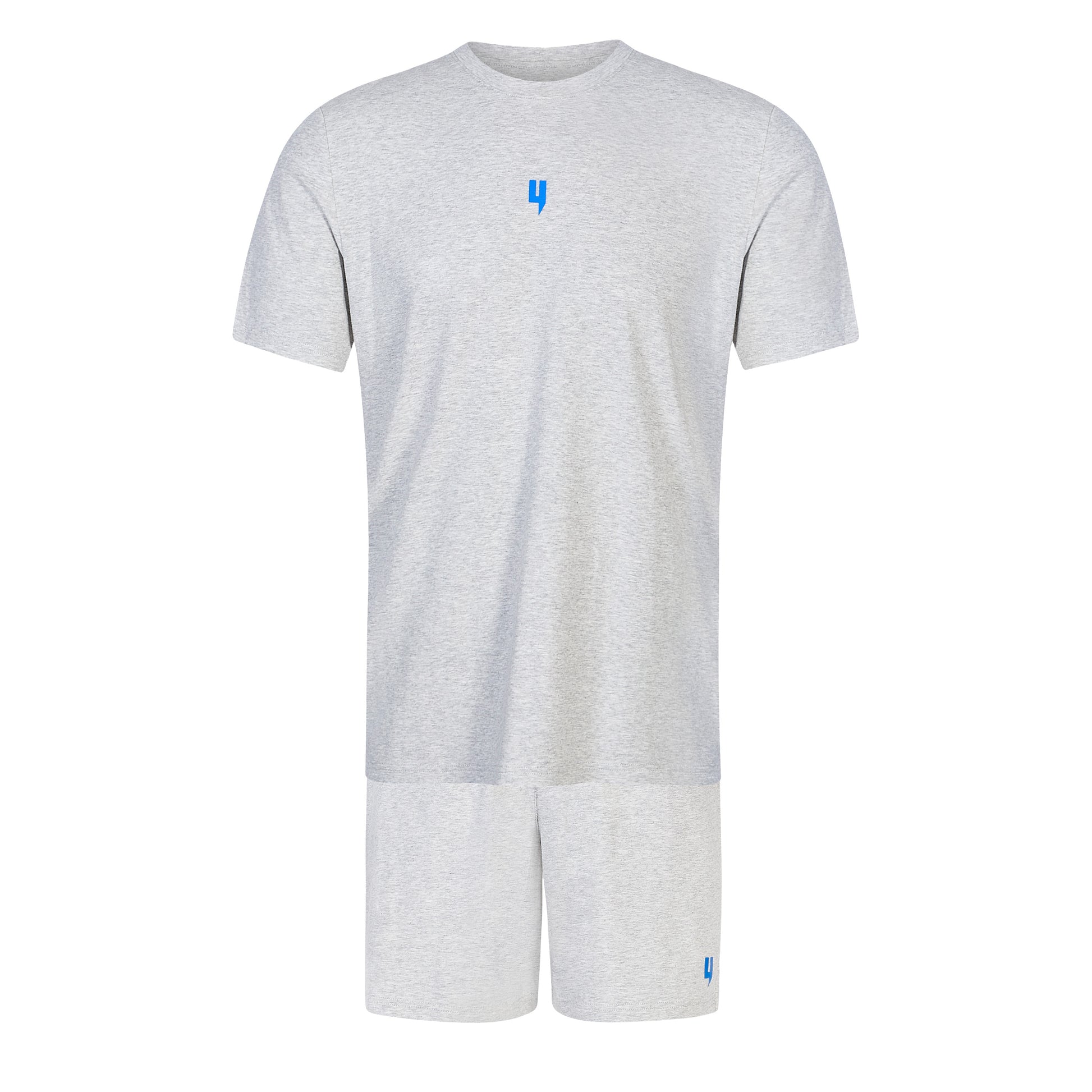 Relax in our latest loungewear set. Designed for ultimate comfort, this set includes 1 pair of grey shorts and 1 grey t-shirt. The shorts are constructed with an elasticated waistband for a relaxed fit and finished with a blue Y logo on the left leg. We have also added two practical side pockets. The tee is designed with the same slim fit as our standard / best-selling t-shirt but is constructed from a softer material with added stretch. Finished with a blue Y logo at the chest.