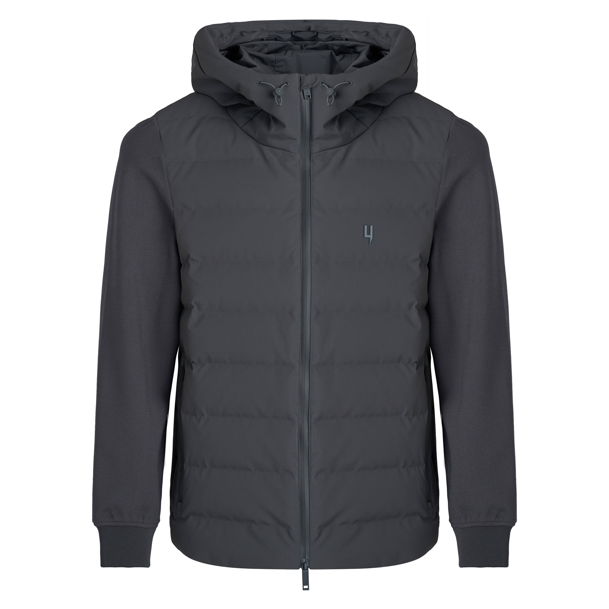 Discover our grey panel jacket. This piece is designed with a quilted hood and front panels plus contrast woven and jersey panels. Finished with raised Y logo branding on the chest, a wet look central zip and bungee cord adjusters on the hem and hood for a customizable fit. The quilted front panels and hood provide a high level of thermal insulation and are both water repellent and wind resistant.